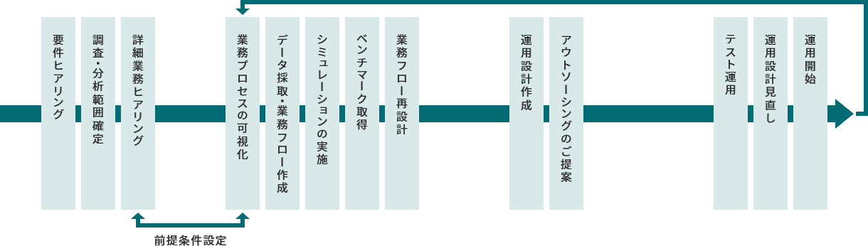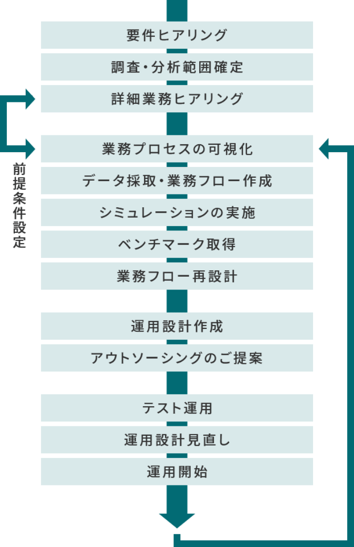 ヒアリングした内容から、現状業務の可視化のための調査を行い、最適な業務フローを作成。作成後、実際にシミュレーションを行い、ベンチマーク(基準値)を抽出し、より最適な業務プロセスを検討。